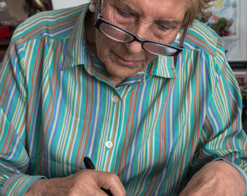 En la foto de Lila, LUZ POZO escribe, de puño y letra, el poema dedicado a Isaac Díaz Pardo, con que se abre el libro ENSAMBLEISAAC, de Paco Díaz. Lo hizo el 31 de julio de 2018.
